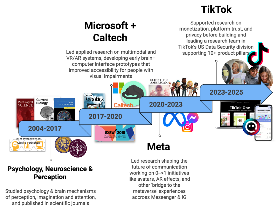 A snapshot of my career — from studying how the brain makes sense of the world to helping teams at Microsoft, Meta, and TikTok design products grounded in data, research, and real human needs.
